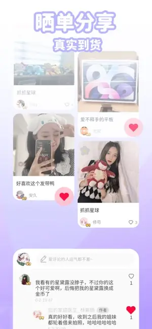 -多方位视角观察,毫秒级延迟领先,更有福利瞄准工具助你更快更准更狠,让你抓得更多。 -抓抓星球所有产品均可快递到家,享受宅家拆快递的快感,完善贴心的客服MM,帮你解决各种问题。 -各种网红萌娃、实用家居、心水美妆应有尽有,紧张的日常活动,每天给你新鲜感和幸福感。 -不定时的娃娃大赛,女神秀绝技,众人来膜拜,轻松愉快的氛围带给你更幸福的体验。